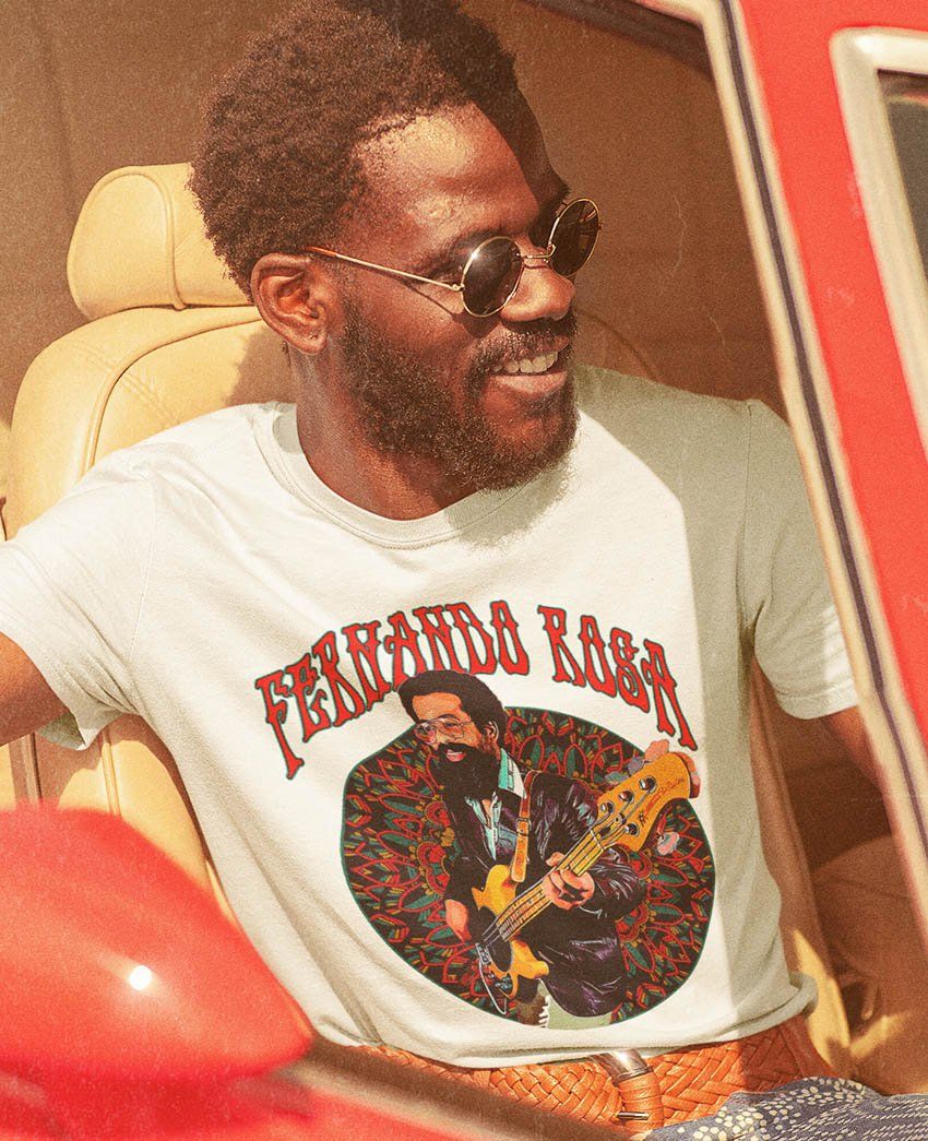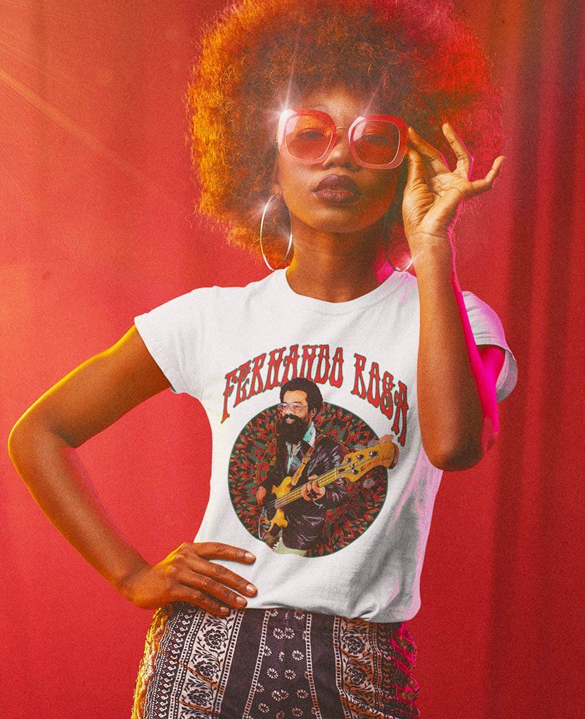 - Escutar os grooves de Fernando Rosa é se sentir em uma casa noturna dos anos 80 tocando Funk, Black-Music e o R&B (Rhythm and Blues). Uma cena de um período que trouxe o swing a dança, uma iconografia colorida à moda e tendências musicais que marcaram gerações. A PARANOID MUSIC fez uma estampa que foca nele, tocando naquela discoteca com uma mandala de fundo que se repete infinitamente em um papel de parede em contraponto ao carpete vermelho em toda boate. Let's go!?